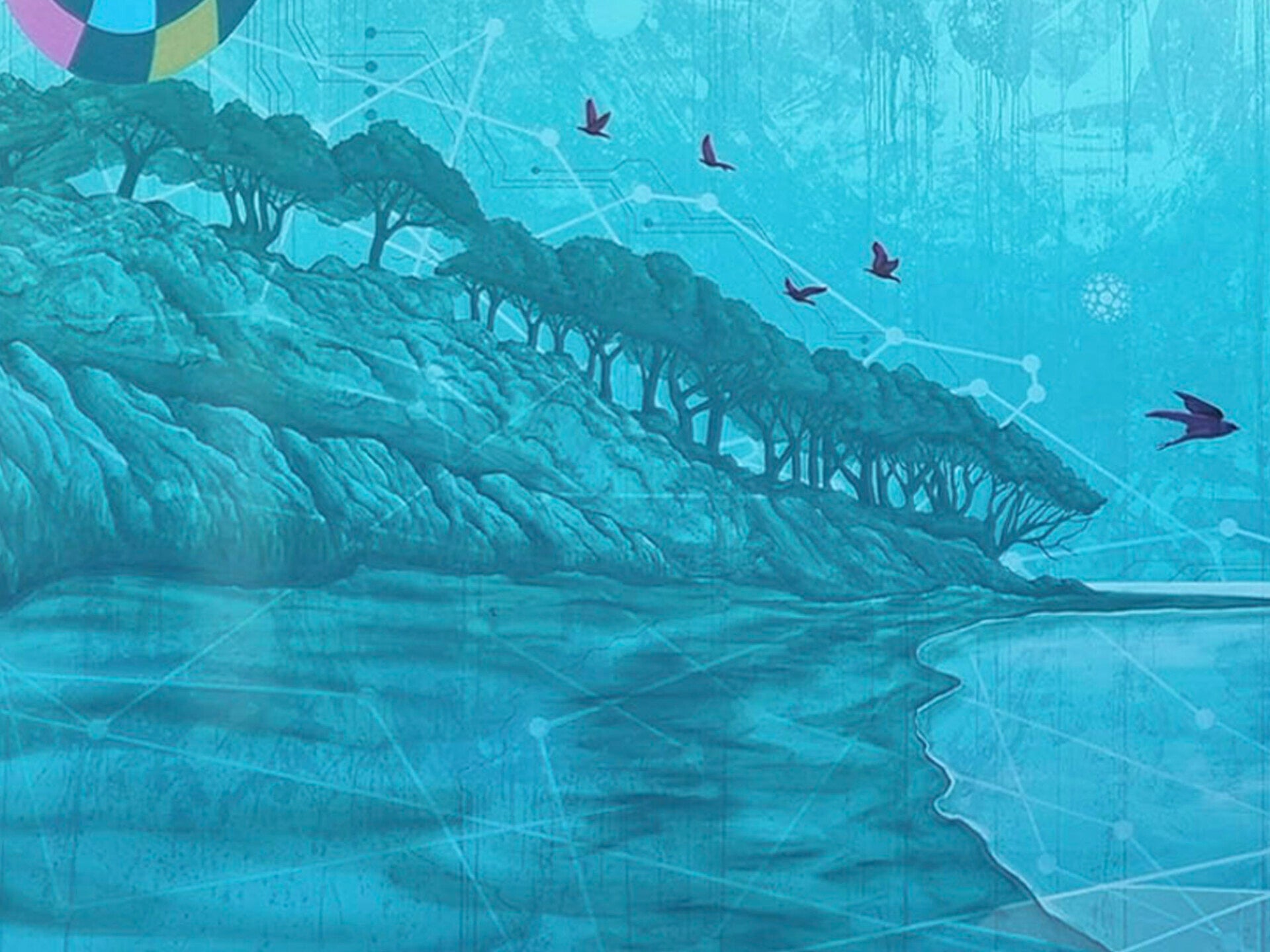 Dette vægmaleri blev skabt i 2023 på en markant væg i et open office-miljø hos et internationalt techfirma, med Slate Contemporary Gallery (USA) som kurator. Værket er udviklet specifikt til stedet og indgår i et arbejdsmiljø præget af teknologi, innovation og globalt udsyn.