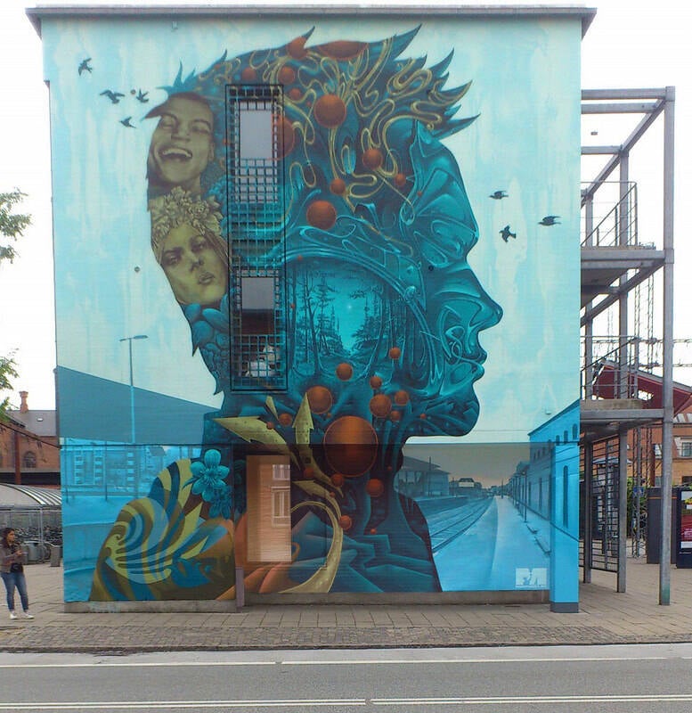 Roskilde Handelsskole ønskede et street art-vægmaleri til den lange væg lige indenfor skolens indgang — et værk, der kunne møde elever og besøgende med energi, fortælling og lokal forankring. Gennem dialog og en længere skitseproces faldt valget på dette vægmaleri, hvor meget var nøje forberedt, men hvor der samtidig var plads til spontane idéer og eksperimenter under selve udførelsen.