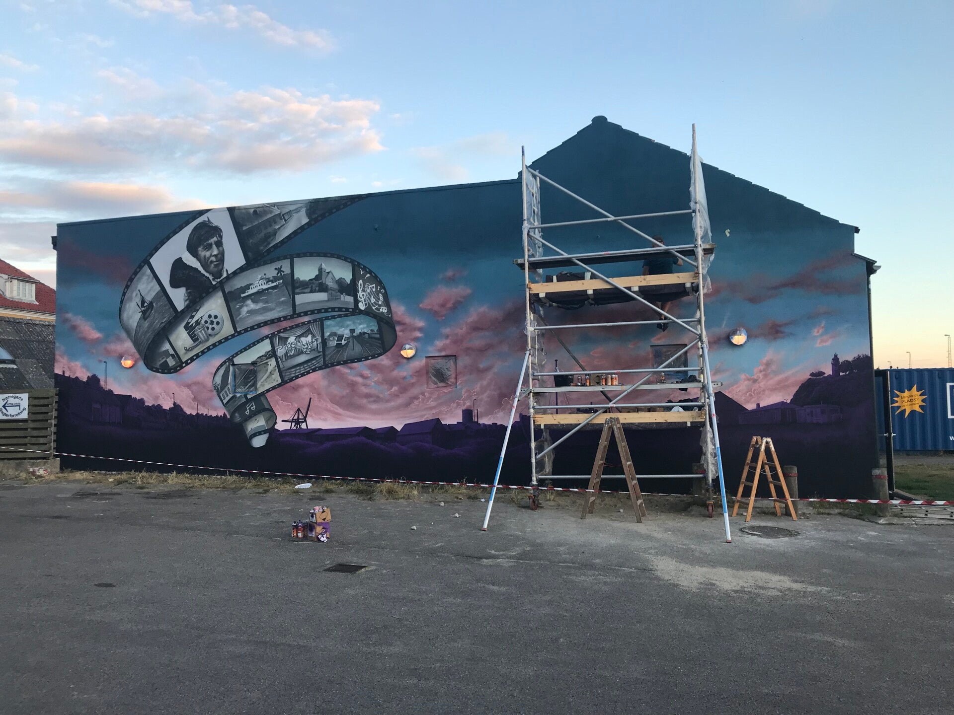 Vægmaleriet på gavlen af Hundested Kino blev til i 2020 som en del af genåbningen af den historiske biograf.