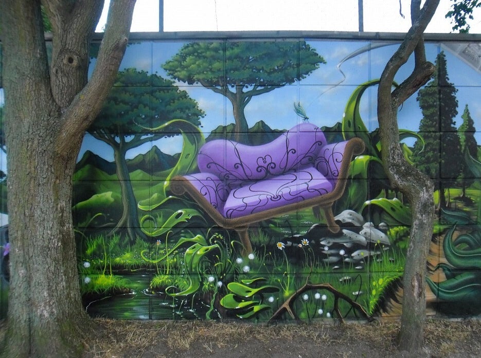Det er samtidig inspireret, og videreudviklet, af omgivelserne omkring vægmaleriets placering, nemlig skateranlæggets kurvede udformning. Fra det relativt simple, over i abstraktion. Fra betonfarver til sandfarver, fra storby til sand og ørken.